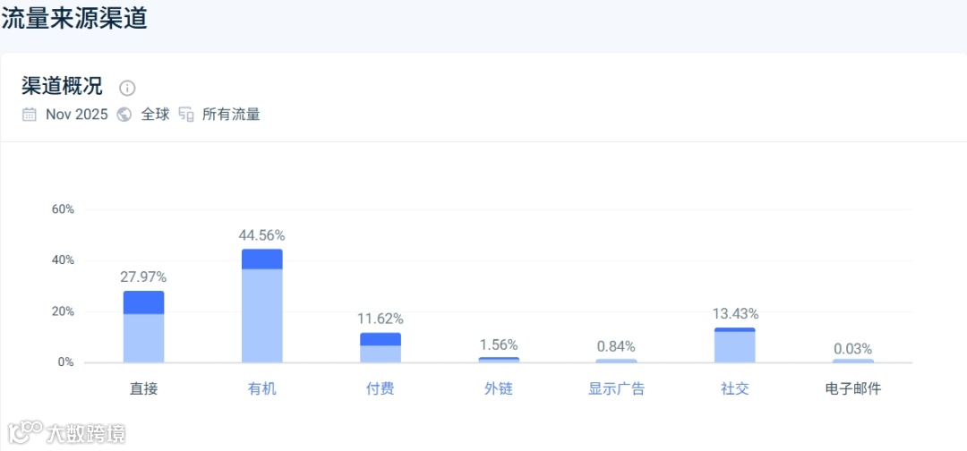 直接访问流量同样占比可观,反映品牌在北美家庭水处理领域拥有一定知名度,并形成指名访问习惯。广告流量更多承担促销和新品推广角色,但不是主要销售驱动力。社交通路承担用户教育和场景内容扩散,用于解释硬水问题与滤芯更换周期等知识点,辅助提升品牌专业度。