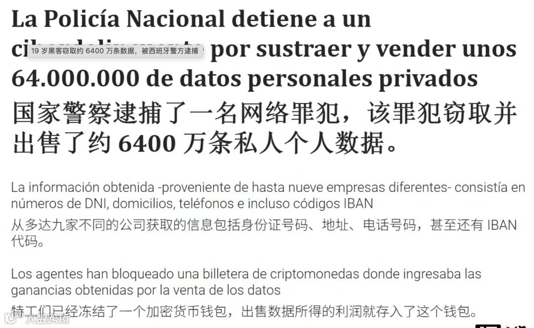 西班牙警方逮捕19岁黑客 涉嫌窃取6400万条个人数据