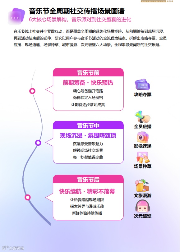报告提炼出音乐节六大核心社交场景:攻略夺票、全员应援、现场速递、场景种草、城市漫游、次元破壁,贯穿活动全周期,实现“无期限续航”。
