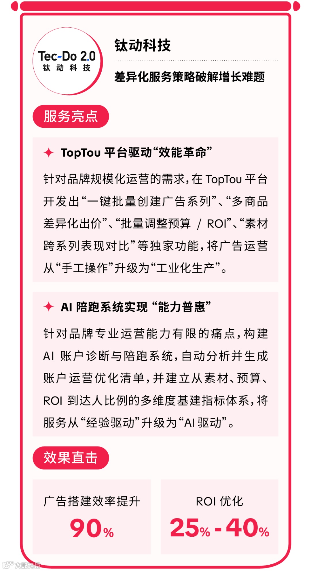 依托TopTou平台的工业化运营能力与AI陪跑系统的双重支持,钛动科技服务的品牌广告搭建效率提升90%,ROI实现25%-40%的显著优化,真正实现运营提效与业务增长的双向促进。