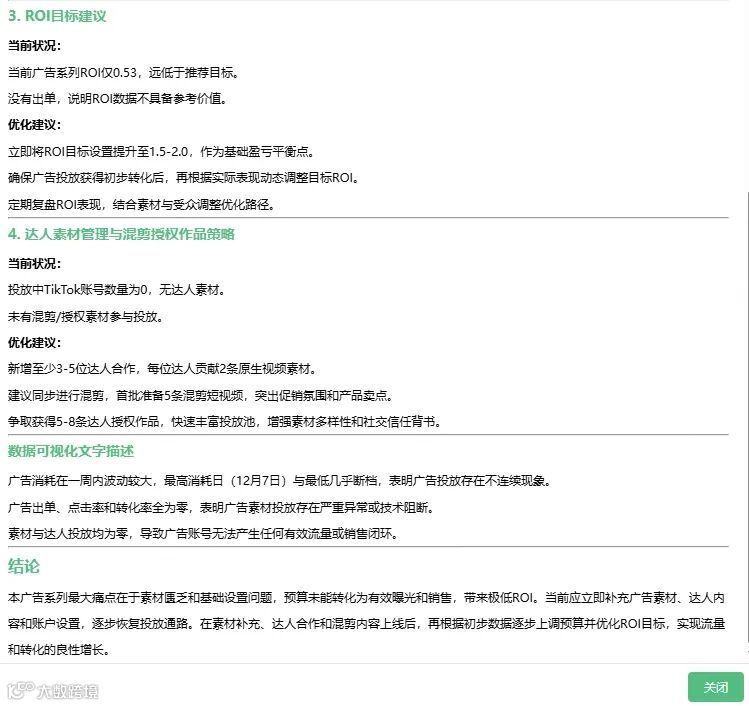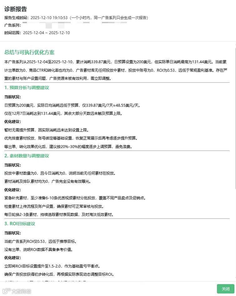 除工具层面的提效外,TopTou平台还通过AI账户诊断与陪跑系统,将运营服务由“经验驱动”升级为“AI驱动”。系统可自动分析账户数据,生成可执行的优化清单,并建立涵盖素材、预算、ROI、达人投放比例等多维度的基建指标体系,实现专业运营能力普惠,帮助中小品牌获得标准化、智能化的投放指导。