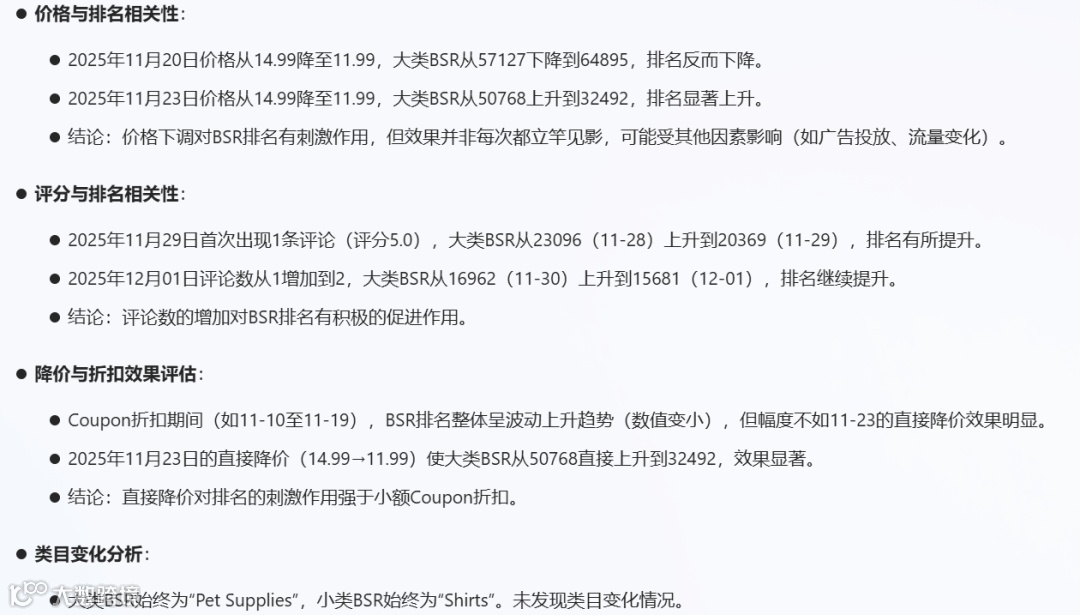 优化价格策略:观察到直接降价对BSR排名刺激作用更强,可考虑在关键时期(如节假日、促销活动)进行更大力度的价格调整,配合广告投放,快速提升销量和排名。