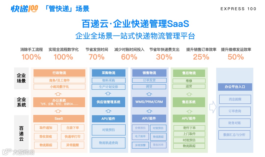 2021年,快递100洞察企业信息化提速趋势,推出“快递管家·企业版”,解决物流管理混乱、成本高企痛点。2023年初,B端品牌升级为「百递云」,定位“快递物流全链路数字化和智能化先锋”,通过“自有系统+SaaS+API”模式,打通行政、采购、销售、售后等职能,实现一体化管理。
