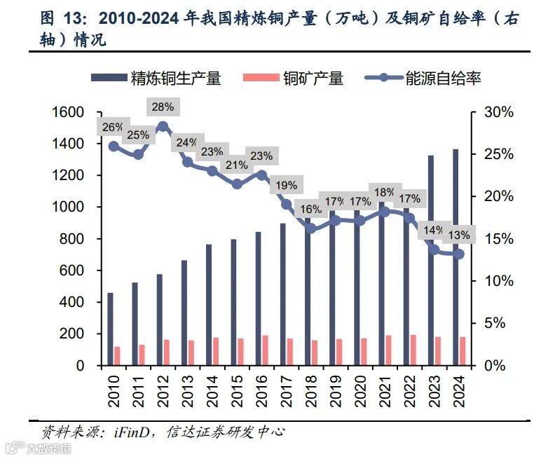 2024年,十种常用有色金属产量达7919万吨,同比增长4.3%;精炼铜、电解铝产量分别为1364万吨、4400万吨,同比增4.1%、4.6%。中国为全球最大精炼铜消费国,2024年消费量达1700万吨,占全球59.4%。然而国内铜矿产量仅180万吨,精炼铜产量1364.4万吨,测算矿山自给率仅13.19%,原料高度依赖进口,且集中于南美、非洲地区,供应风险突出。