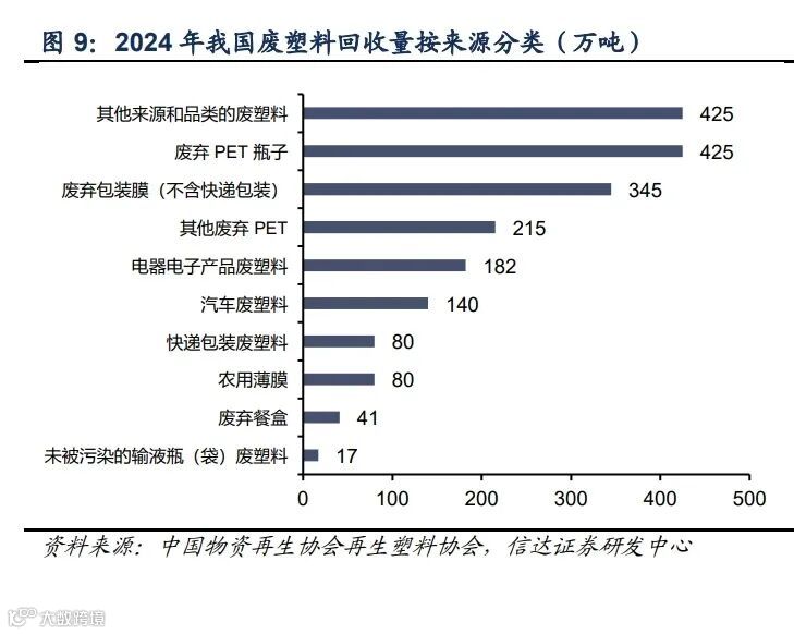 废塑料来源分散,主要品类包括PET瓶(425万吨,占比21.8%)、包装膜(345万吨,17.7%)、电子废弃物塑料(182万吨,9.3%)。按材料分类,2024年废PP、PE、PET回收量分别为415万吨、410万吨、640万吨,各占约21%、21%、33%。