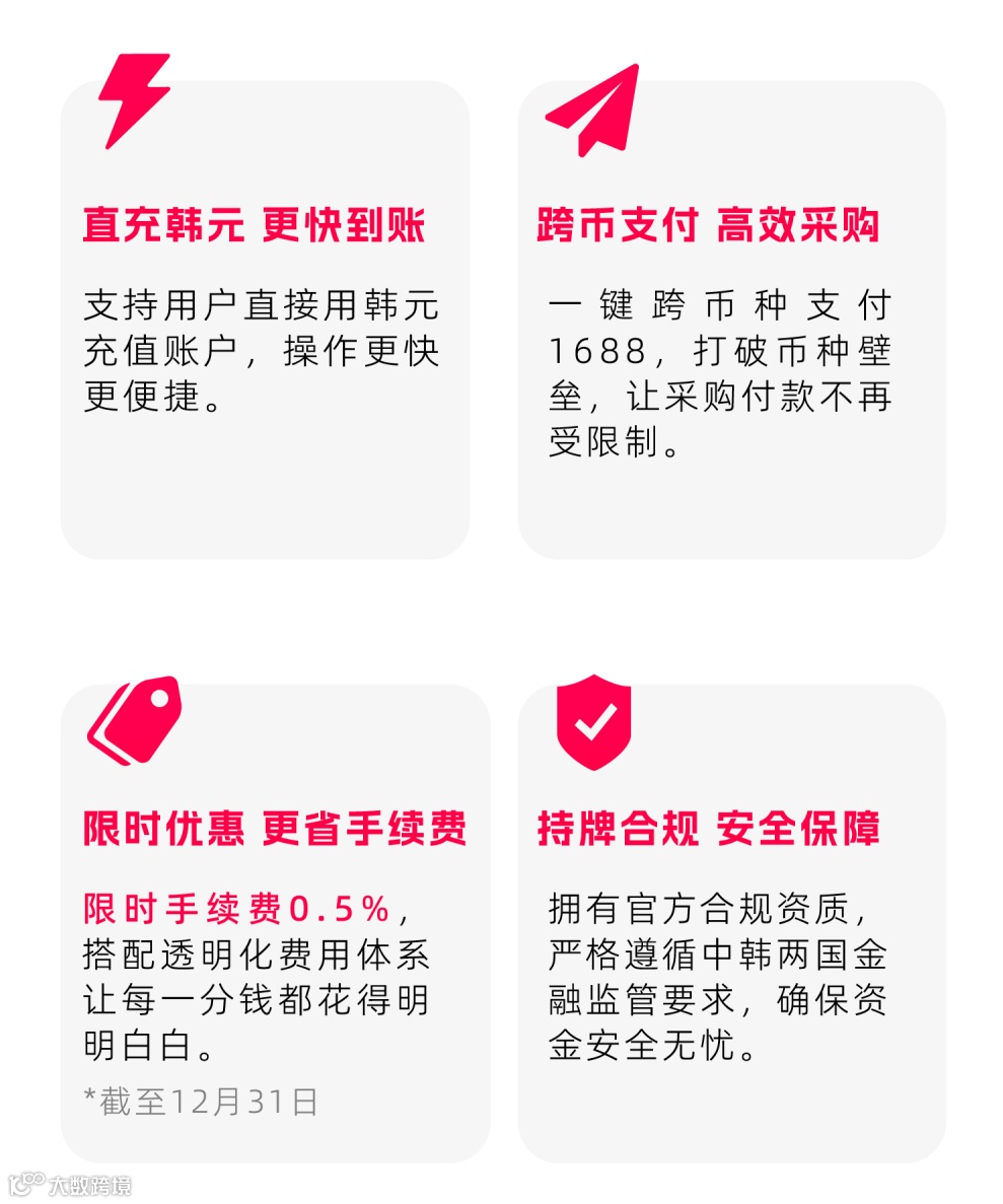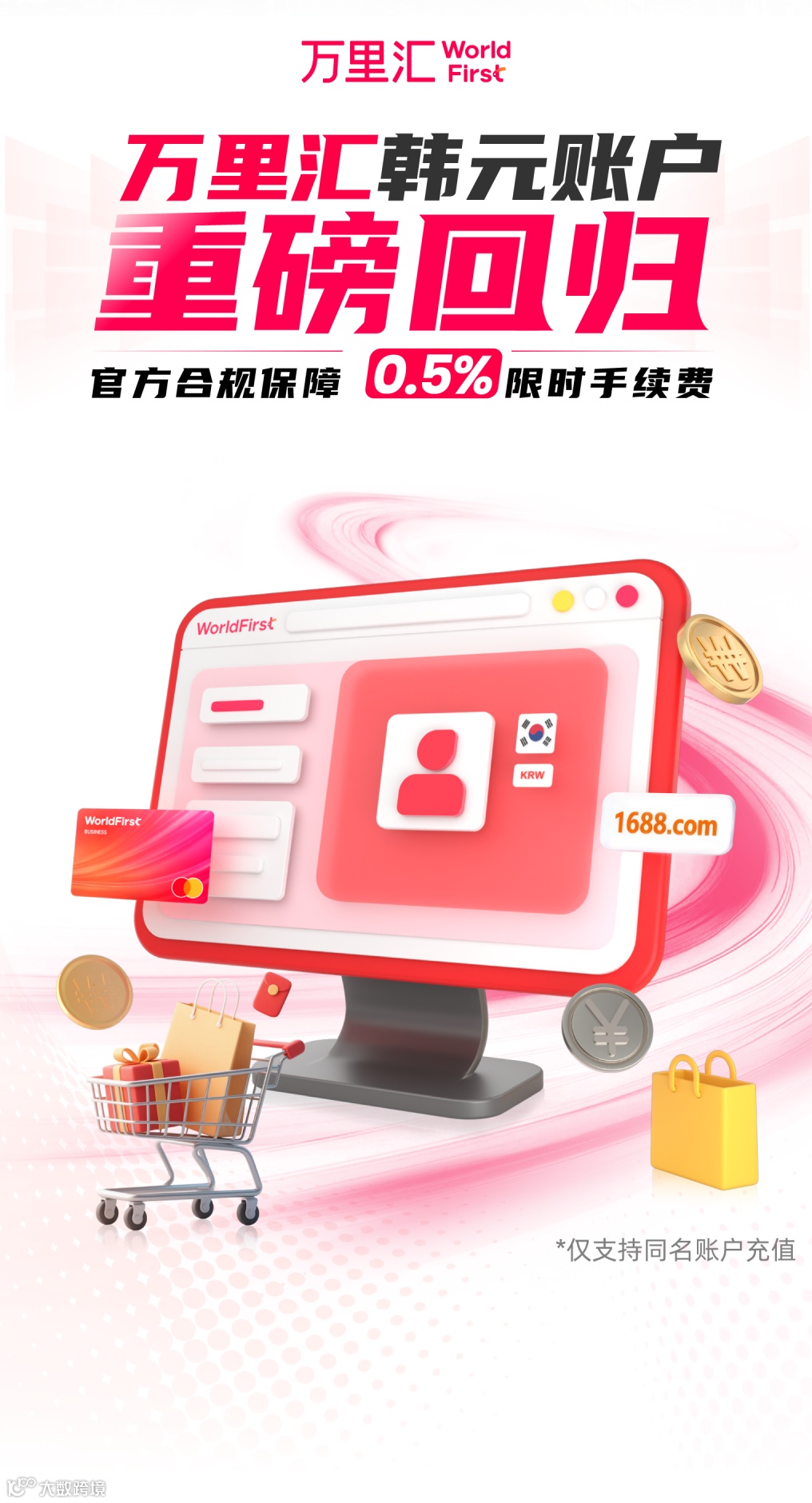 万里汇正式推出韩国站WorldFirst跨境宝KRW跨币种直付功能,支持1688/TaoWorld订单支付,助力在韩展业的企业及个体商户实现高效、低成本的资金结算。