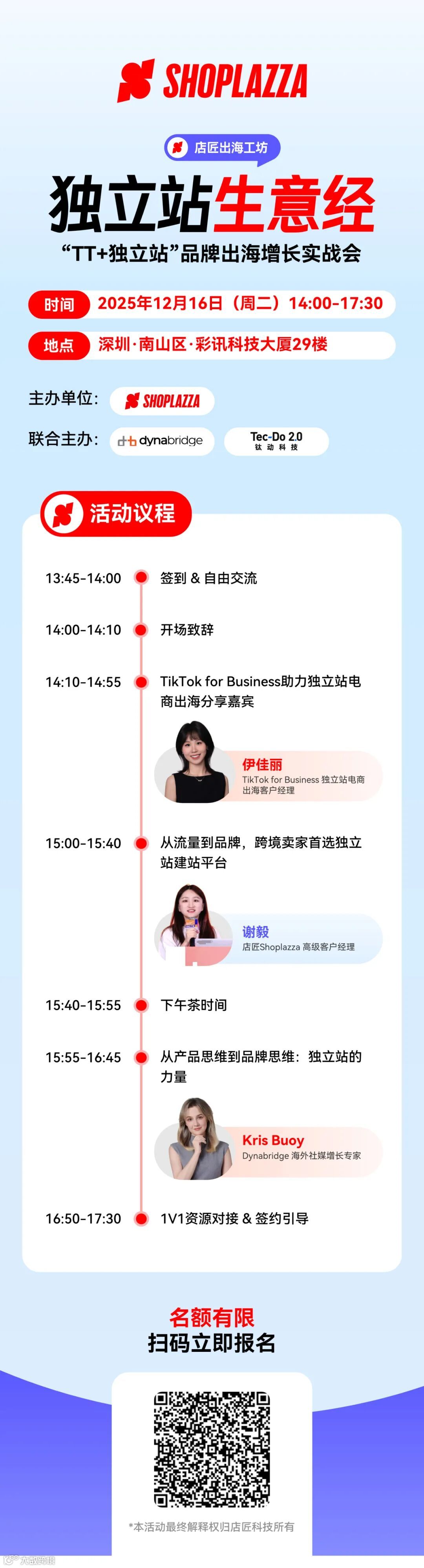 12月16日,店匠Shoplazza联合TikTok Web官方、Dynabridge、钛动科技,在深圳举办「TT+独立站品牌出海增长实战会」,聚焦TikTok与独立站的流量联动、高转化内容设计、私域复购闭环等核心议题,助力商家打通“流量-转化-复购”全链路。