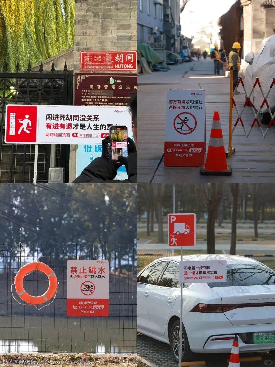 京东快递不止于胡同传播,更将广告延伸至交通路牌、温馨提示牌等形式,成为生活中的“小确幸”。退货不再只是消费后续动作,而是被赋予“会过日子”的智慧标签,精准承接高峰期用户需求。