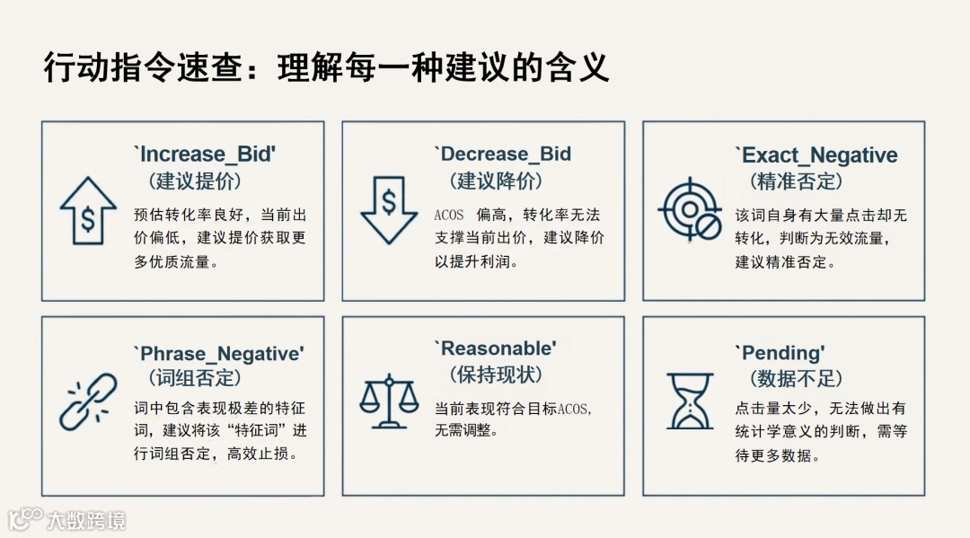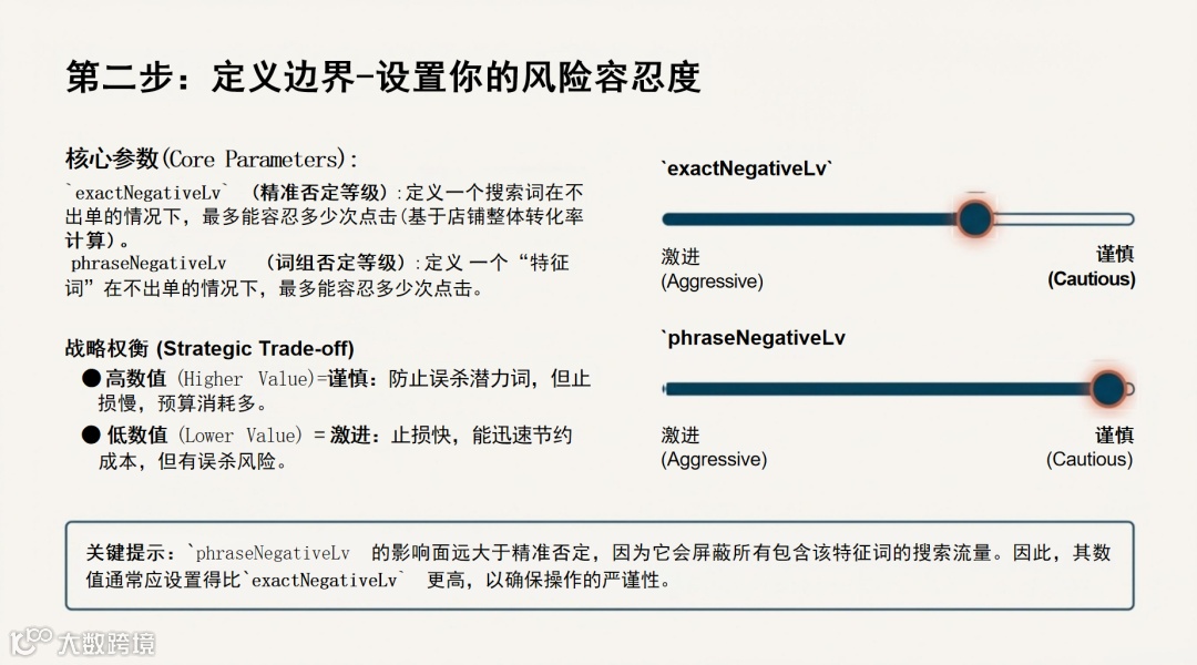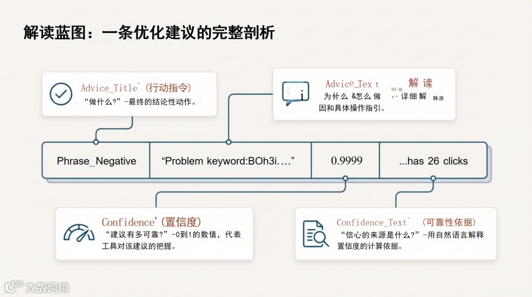 你的产品是男士真皮钱包,但报告里混入了很多带有 womens(女士)、canvas(帆布)的垃圾流量。这些词分散在各个角落,很难一个个揪出来。 在 Split_Words 的汇总列表里可以会一眼看到问题所在,并且在Opti_Advice 中给出 短语否定 的建议。你只需否定一个词根,就能屏蔽掉成千上万个包含该词根的垃圾搜索词,效率极高。