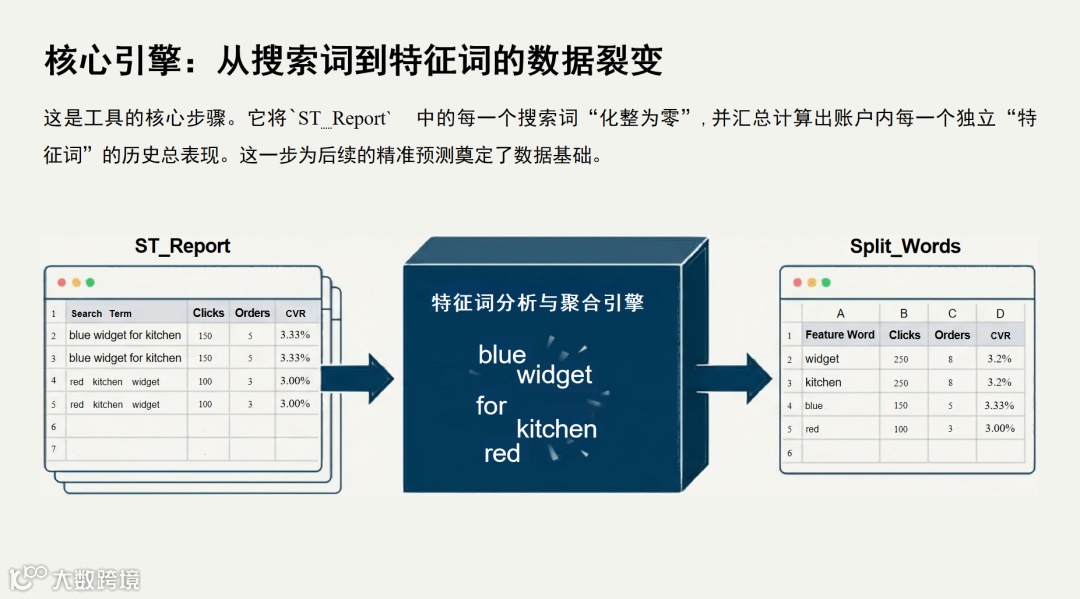 Split_Words 的作用:化整为零,积少成多。 它不看那个完整的长尾词,而是把它拆碎看单词。从而实现把无数个无法分析的小数据,汇总成了具有统计学意义的大数据。