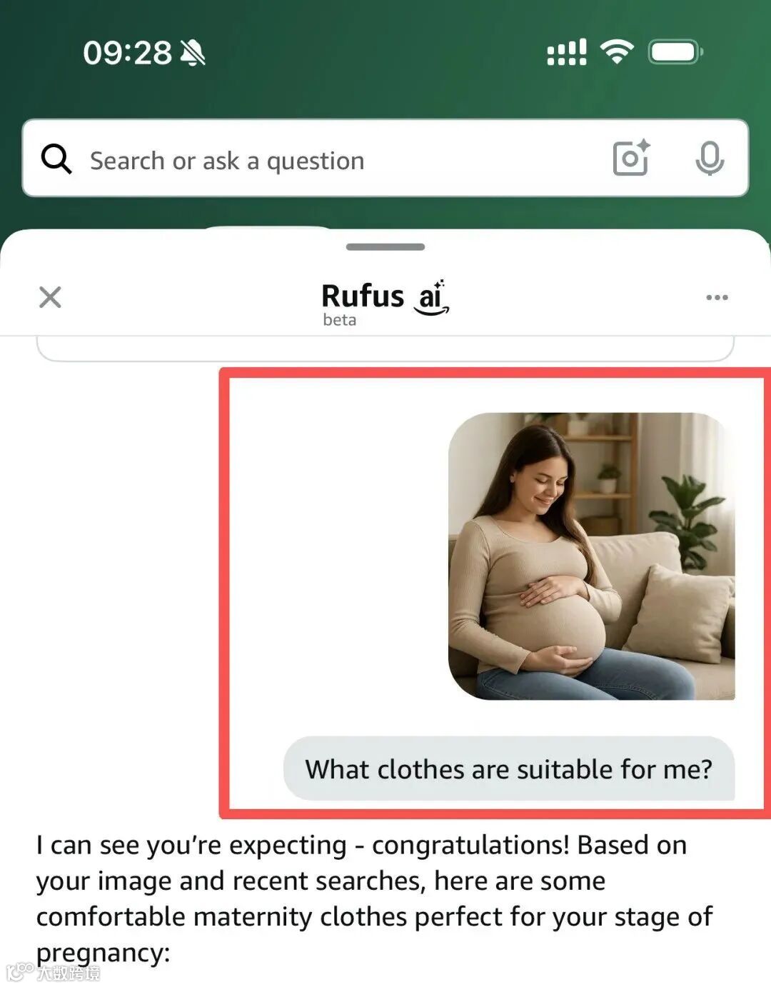 更直观的案例是亚马逊的 AI 助手 Rufus:有人上传了一张孕妇照,没提任何语义,Rufus 会自动回复:“恭喜怀孕,这里是适合孕期的产品推荐。”