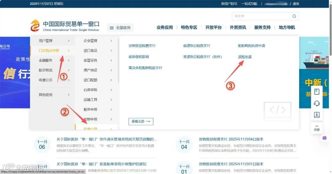 (3)登录“单一窗口”后,点击“全部应用”->“口岸执法申报”->“税费办理”->“退税申请”即可进入退税无纸化申请模块。