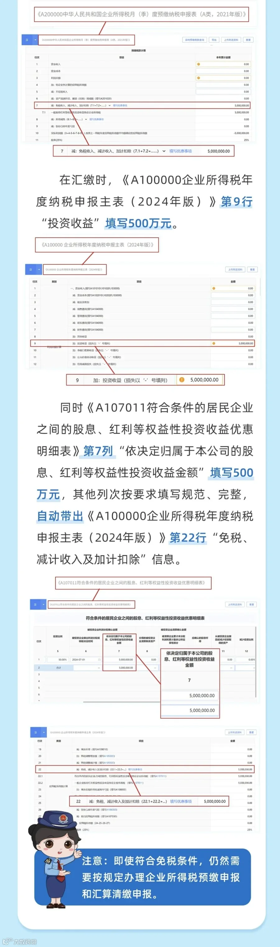 A公司在年度汇算清缴时,应在《企业所得税年度纳税申报表》中如实填报长期股权投资及投资收益情况,并在“免税、减计收入及加计扣除优惠明细表”(A107010)中填列符合条件的免税股息红利金额,留存相关证明材料备查。