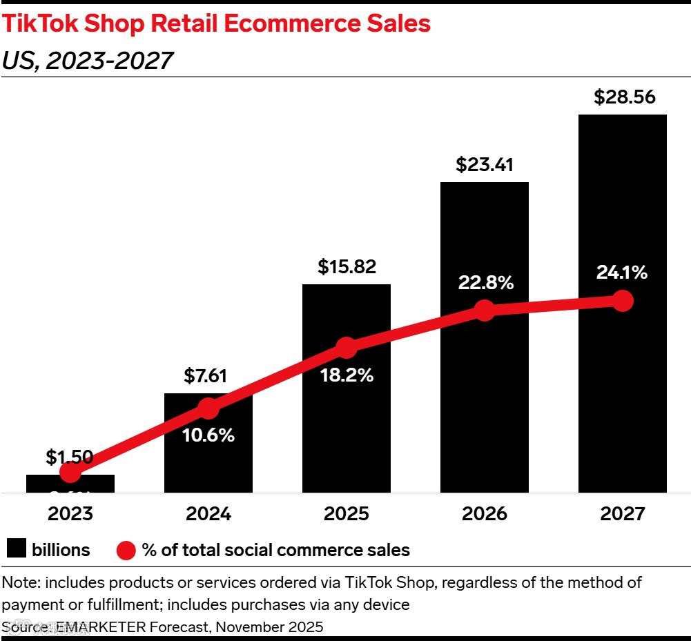 eMarketer最新预测显示,2025年美国社交电商整体销售规模约为870亿美元,而TikTok Shop以158亿美元的销售额拿下约18.2%的份额。