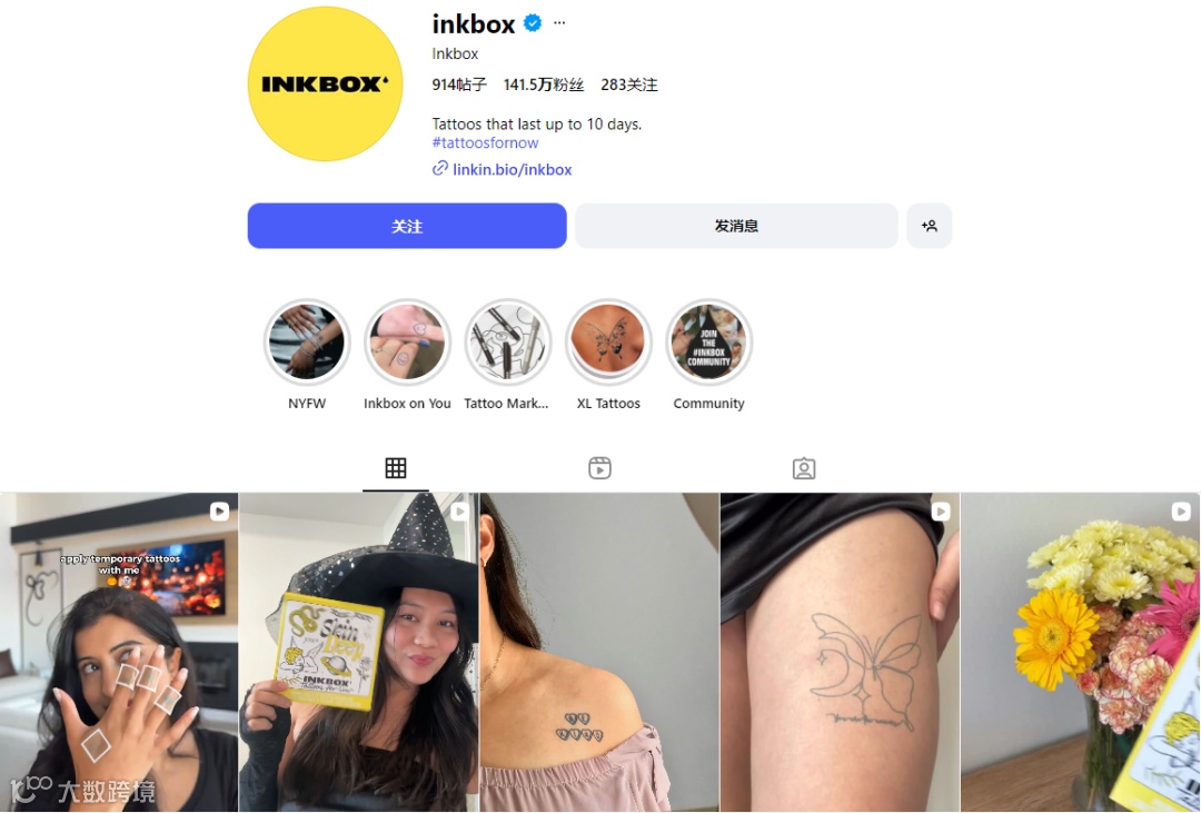 Instagram营销:对于纹身贴这类视觉品类说,Instagram是一个重点平台。我们会发现Inkbox在Instagram上所发布的内容,大多为艺术家签名、设计师合作、真人上身效果等,且非常注重视觉冲击性与潮流特性,这使其平台更像一个“纹身文化+潮流表达”的社区,而非单纯的销售渠道。这种社群式传播,是能够突破消费者心理防线,从而促进转化的。