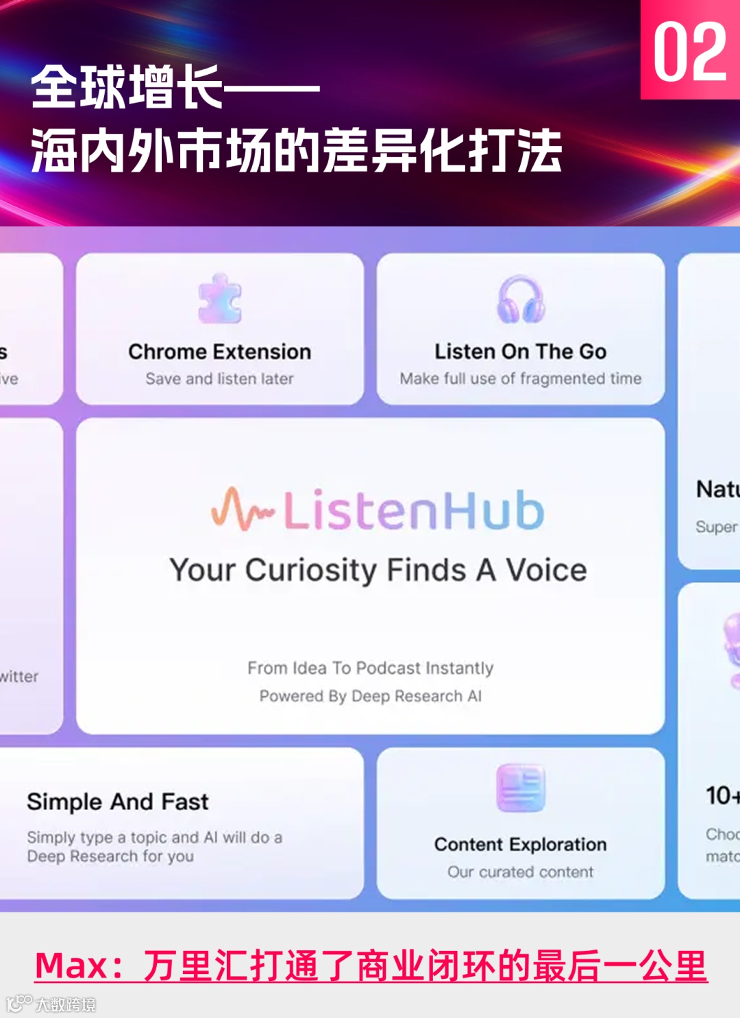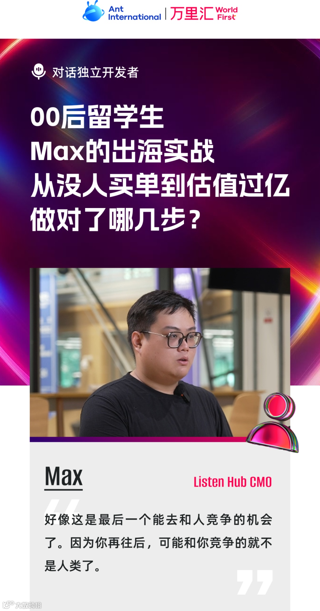 说出这番话的,是 Listen Hub 的 CMO Max。作为一名00后留学生,他自2017年起便关注人工智能,坚信其为未来发展方向。他带领团队打造的AI音频创作工具,上线仅四个月即吸引全球超10万用户,支持119种语言,估值突破亿元人民币。从AI内容生成到赋能创作者,他是如何在竞争激烈的赛道中脱颖而出?他的经历或能为身处AI浪潮中的创业者提供启发。