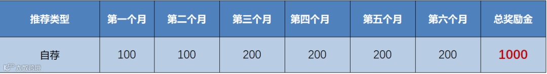 自我推荐奖1000元,共分6个月发放,入职满一个月开始随工资发放: