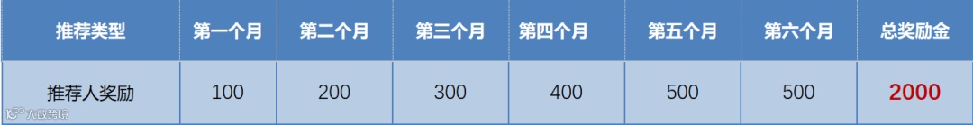 推荐一人奖2000元,共分6个月发放,入职满一个月开始随工资发放: