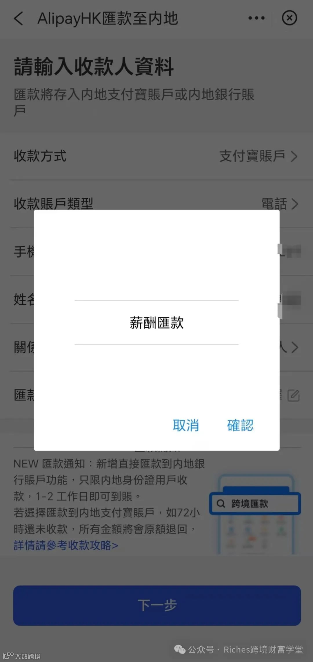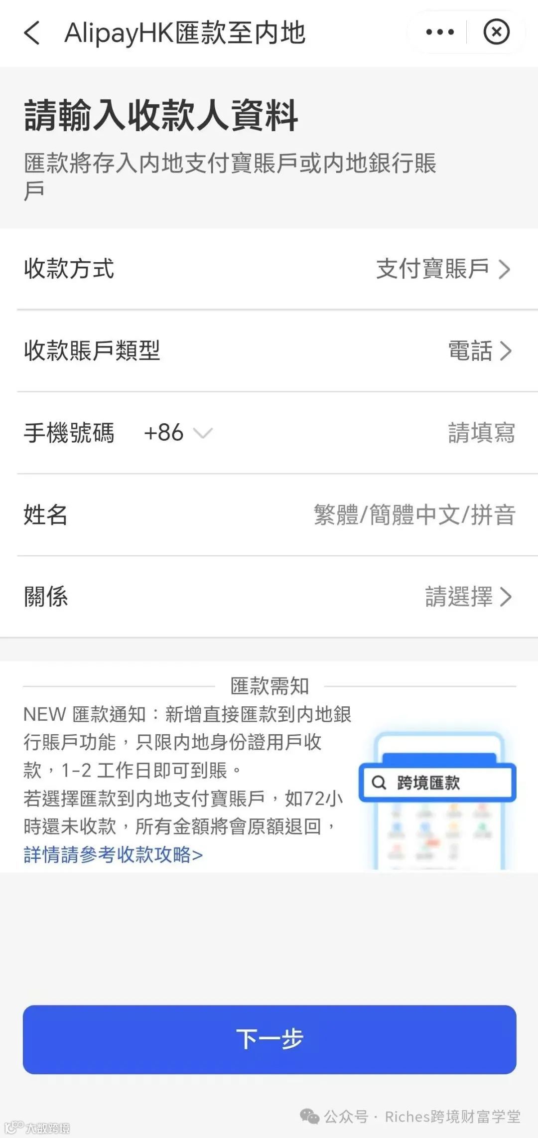 进入Alipay HK App,选择“汇款”功能,点击“汇款至内地”[1]。