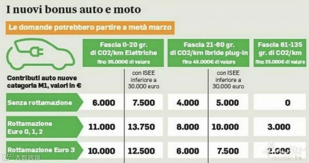 申请者需报废一辆排放标准为欧5或更低的内燃机车辆(须持有至少6个月),方可享受补贴[k]。个人购车者中,年家庭收入(ISEE)低于3万欧元的最高可获1.1万欧元补贴,收入在3万至4万欧元之间的可获9000欧元;小型企业最高补贴额度为2万欧元[k]。补贴金额不得超过新车总价的30%[k]。