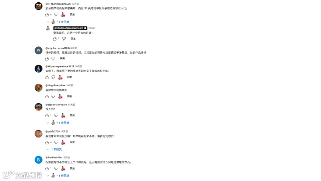 通过这种接地气、实用性强的呈现方式,吸引了大量真正对割草机有需求的用户,积极的评论区提问交流,进一步增强了品牌的可信度和用户粘性,此视频目前发布两周时间,已经达到2.2万播放。