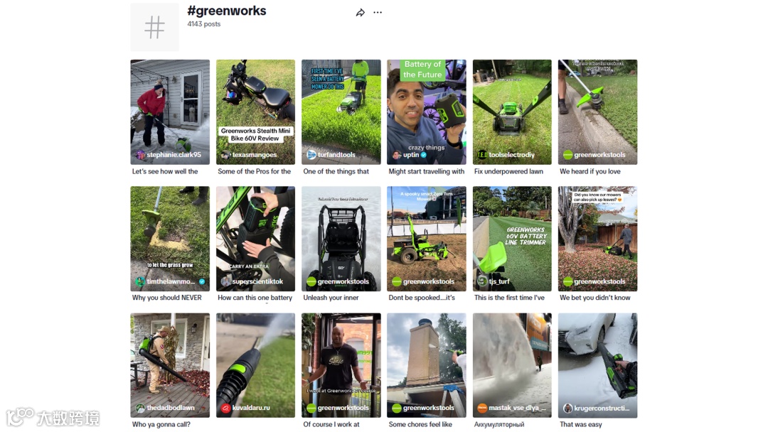打造了#Greenworks话题,鼓励用户上传使用体验视频,增强参与感,在此基础上,UGC内容进一步激发用户热情,使品牌传播从单向信息输出转向真正的双向互动。