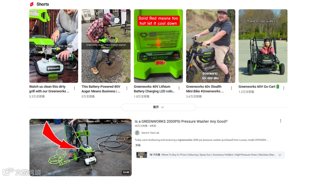 在YouTube上,Greenworks会邀请欧美家装DIY达人进行“硬核测评”,量级在50万至200万之间,达人会将锂电工具与传统燃油工具摆在一起对比,直观展示“用电的比烧油的”到底好在哪!