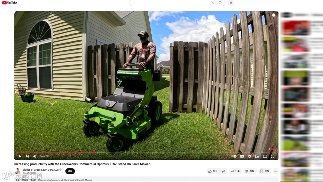 在合作视频中,Blades of Grass Lawn Care, LLC展示了如何使用商用Optimus Z 36英寸立式割草机来提升工作效率,详细介绍了割草机的设计与操作,包括其36英寸的割幅和立式驾驶方式,突出其在提高生产力方面的优势,同时,通过实际操作演示,展示了在处理大型草坪时的高效表现,显著缩短作业时间并提升整体工作效率。