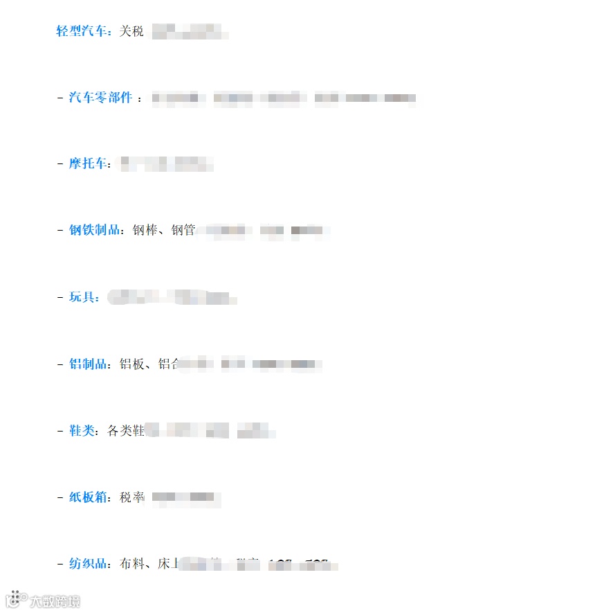 目前已知的是纺织品类706项、钢铁产品249项、汽车及零部件94项、塑料制品81项,除此之外有341个分类是被执行35%的高税率,302个是执行10%税率还有316个分类是实行免税。
