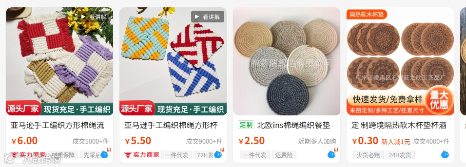 ✅ 刚需 + 潮流,需求旺盛:海外家庭重视家居装饰,手工编织杯垫、餐垫是厨房 / 餐桌刚需,且 “自然材质 + 手工感” 契合波西米亚、极简风潮流,Etsy 平台相关关键词月搜索量超 120 万,市场潜力巨大;