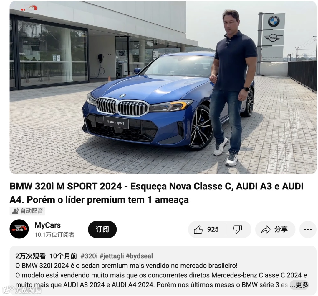 在近期发布的一期内容中,MyCars评测了2024款BMW 320i M SPORT,并将其与梅赛德斯C级、奥迪A3/A4进行了横向对比。虽然这期视频本身聚焦于豪华轿车市场,但也从侧面透露出一个趋势——拉美年轻用户越来越关注性价比、科技配置与品牌调性三者兼具的中高端车型。而这正是中国品牌,尤其是长城近年来主推的新能源SUV和混动产品所擅长的领域。截止到目前,视频播放量也突破了2万次,点赞数也达到了928次。