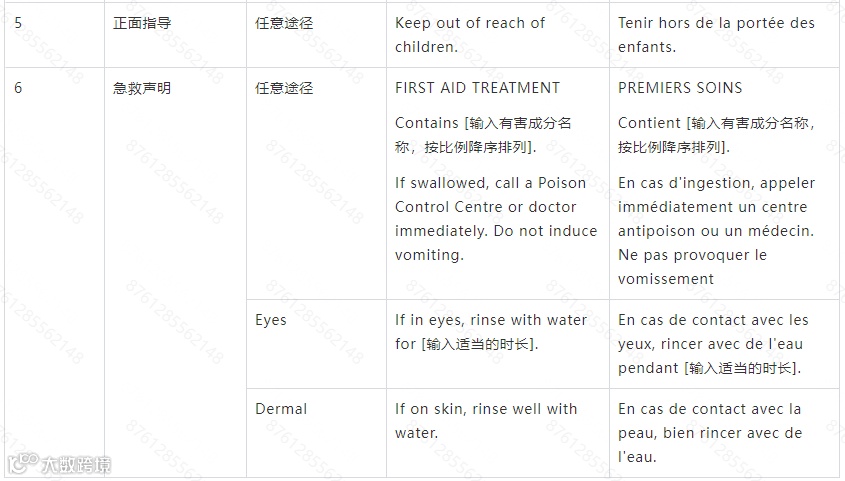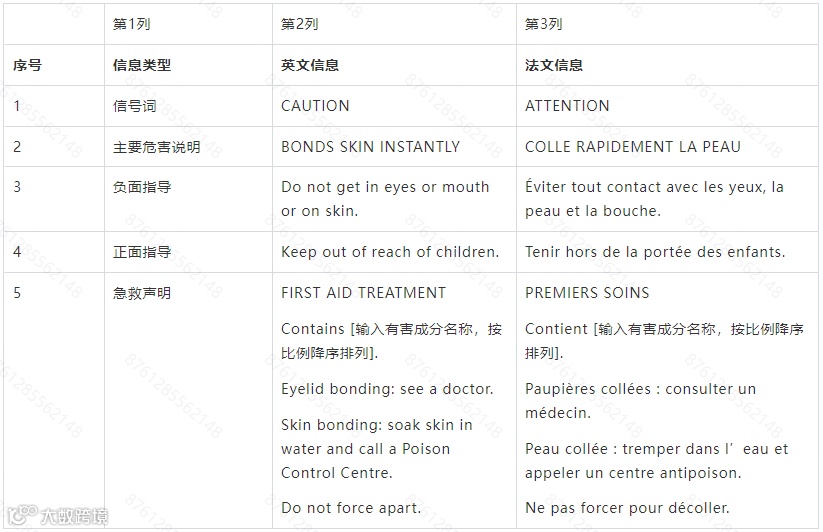 注意:当快速皮肤粘合剂容器的主板面面积小于35平方厘米时,只需按照第条例24条第(3)款规定的字体高度和字体大小显示表格中序号2和序号5的英文及法文信息。