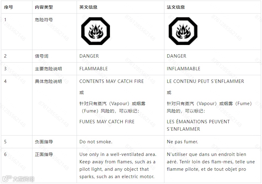 该表格信息可能随时更新,请以《消费化学品和容器条例》(CCCR 2001) 第54款(2)附表Required Information — Sub-Category “Flammable”为标准。