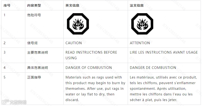 该表格信息可能随时更新,请以《消费化学品和容器条例》(CCCR 2001) 第54款(3)附表Required Information — Sub-Category “Spontaneously Combustible”为标准。