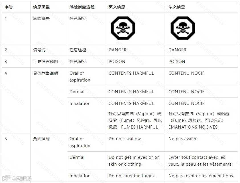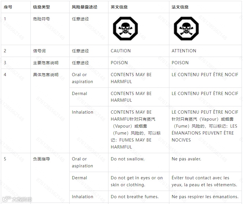 该表格信息可能随时更新,请以《消费化学品和容器条例》(CCCR 2001) 第39(1)附表Required Information — Sub-Category “Toxic”为标准。