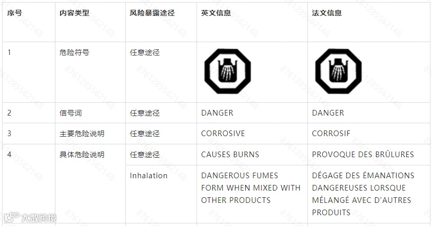 该表格信息可能随时更新,请以《消费化学品和容器条例》(CCCR 2001) 第46款(2)附表Required Information — Sub-Category “Corrosive”为标准。