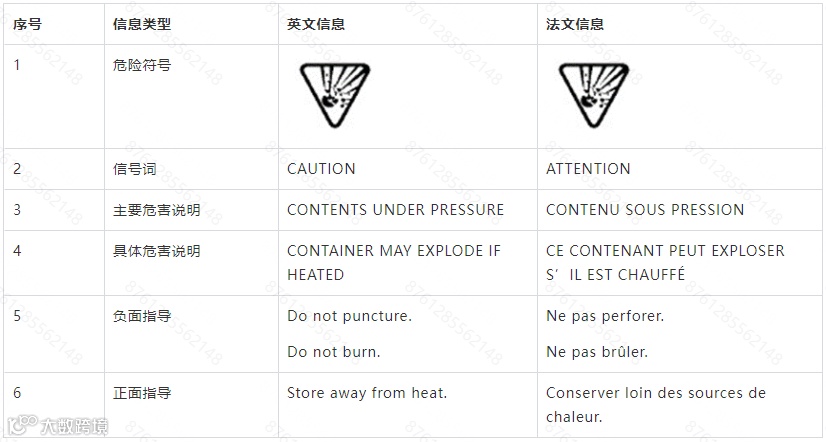 该表格信息可能随时更新,请以《消费化学品和容器条例》(CCCR 2001) 第59条附表Required Information — Pressurized Containers为标准。