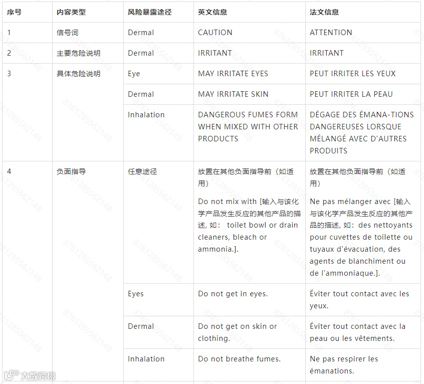 该表格信息可能随时更新,请以《消费化学品和容器条例》(CCCR 2001) 第46款(3)附表Required Information — Sub-Category “Irritant”为标准。