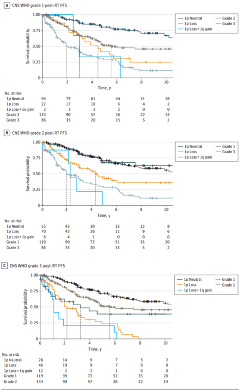1、1p缺失与PFS缩短显著相关,在1p缺失基础上,1q扩增使脑膜瘤等同于WHO 3级(无论初始分级)