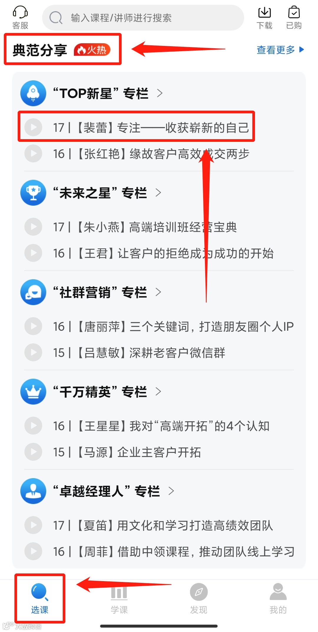 请按照以下流程找课: ①下载“TOP论坛”APP ②打开APP进入“选课”页面 ③下滑至“典范分享”版块 ④找到“TOP新星”专栏裴蕾老师课程点击即可进入 |