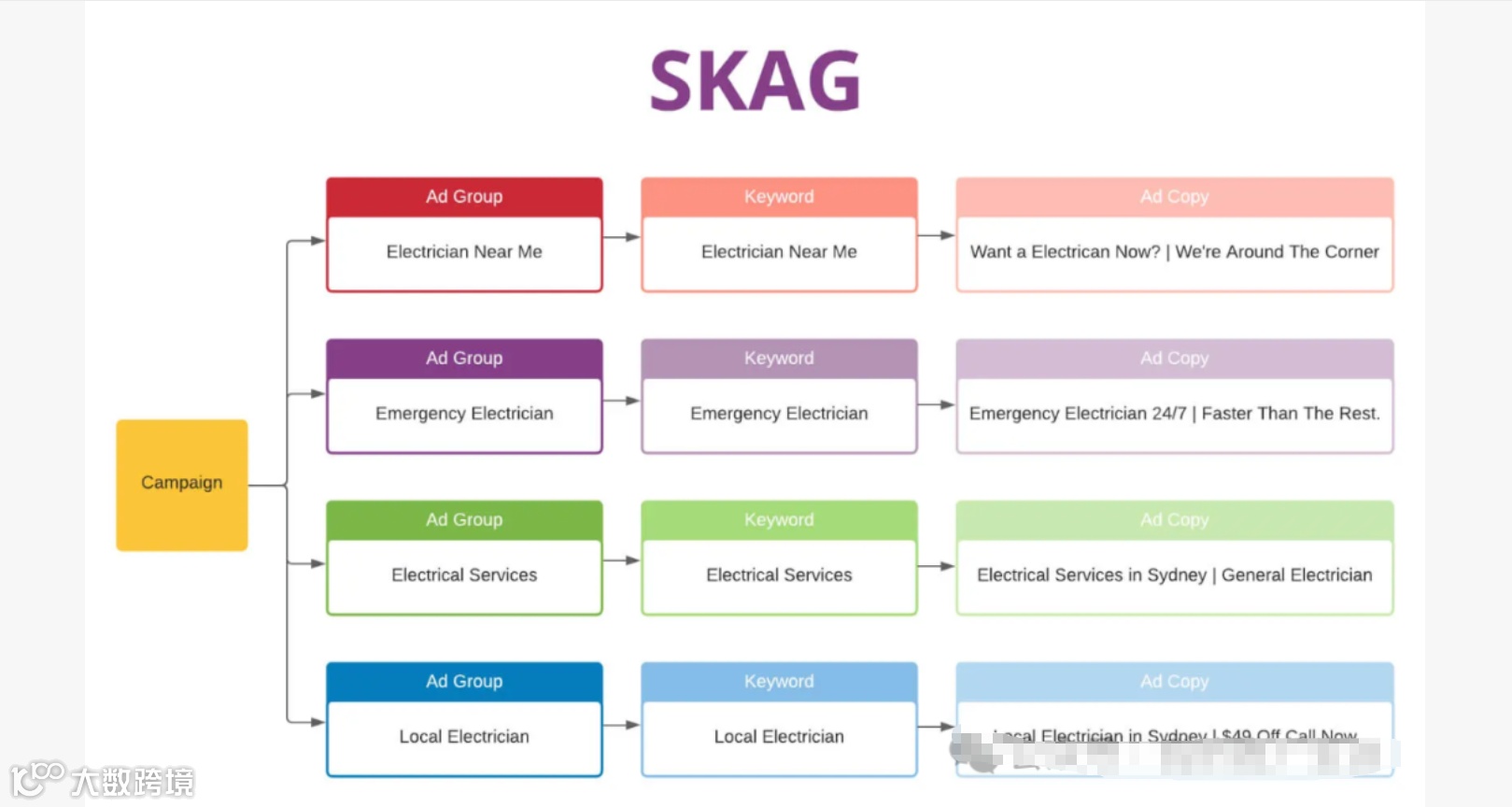 例如:为广泛匹配、词组匹配、完全匹配各建一个系列。在智能出价时代,这意义不大,除非您有极其特殊的预算控制需求。