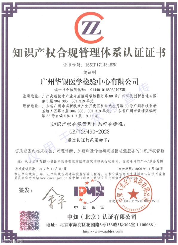 2025年10月15日,中知(北京)认证有限公司委派专家组对广州华银医学检验中心有限公司知识产权合规管理体系进行年度监审及认证转换审查。此次现场审查会议上,中知(北京)认证有限公司审核专家组对我司知识产权合规管理体系及运行工作给予了高度认可及充分肯定。