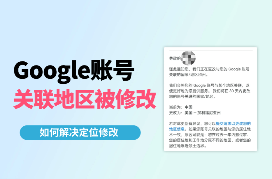 有用户在使用 Google 服务时,突然收到通知:“您的账号与某个国家/地区有关联,关联国家/地区发生变更” ——也就是说,原本显示为 A 地区的账号,现在变成 B 地区。