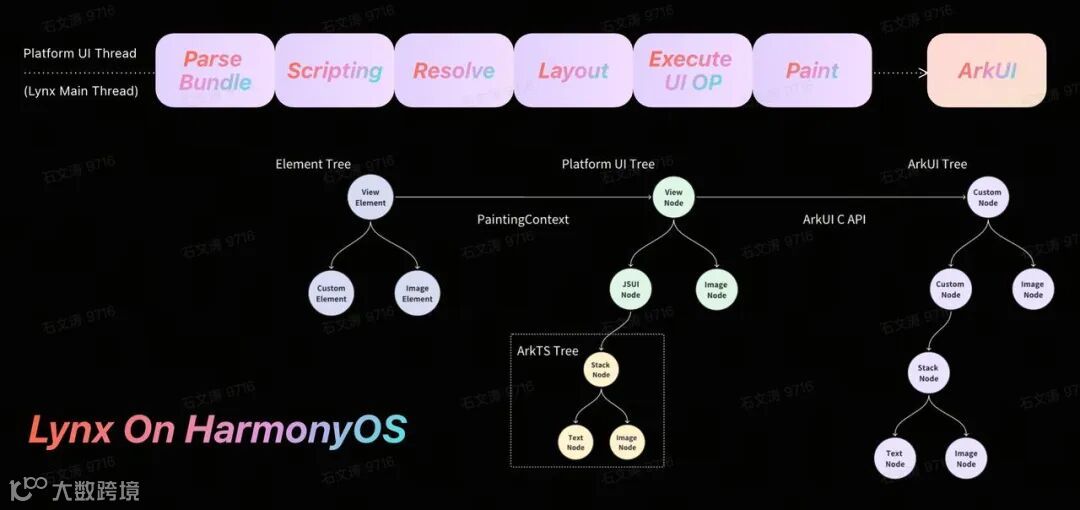 Lynx 在 Android、iOS、HarmonyOS 上 CSS、原生组件等功能高度一致得益于 Lynx 的架构实现:在多平台上 Lynx 的渲染流水线是 共用、一致的。在 HarmonyOS 上,Lynx 渲染指令与 HarmonyOS 的 ArkUI 渲染组件对接,进而实现 CSS 属性绘制、动画、自定义组件等。