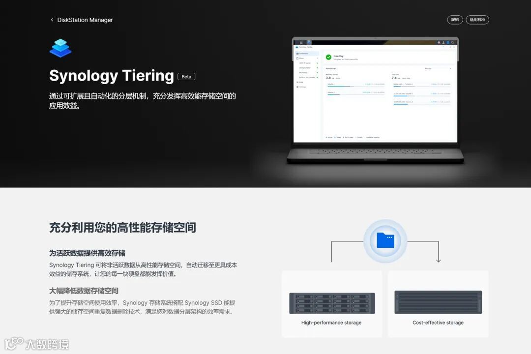 Synology Tiering是DSM7.3新增的分层机制,可以简单理解为更高级好用的SSD Cache,更合理的自动化分配冷存储数据存放,从而降低高性能环境的搭建成本。