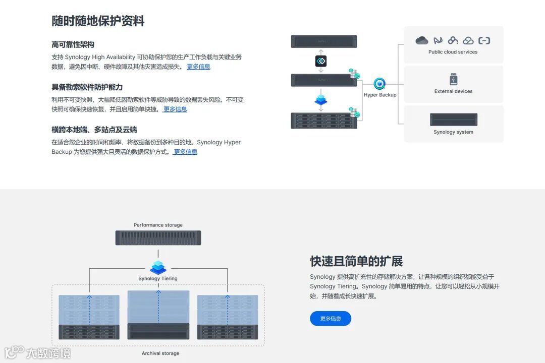 对比友商原理相同的分层机制,Synology Tiering多了多套件联动,可以搭配Synology High Availability、快照和Synology Hyper Backup使用,有着更灵活的数据分发+备份表现。
