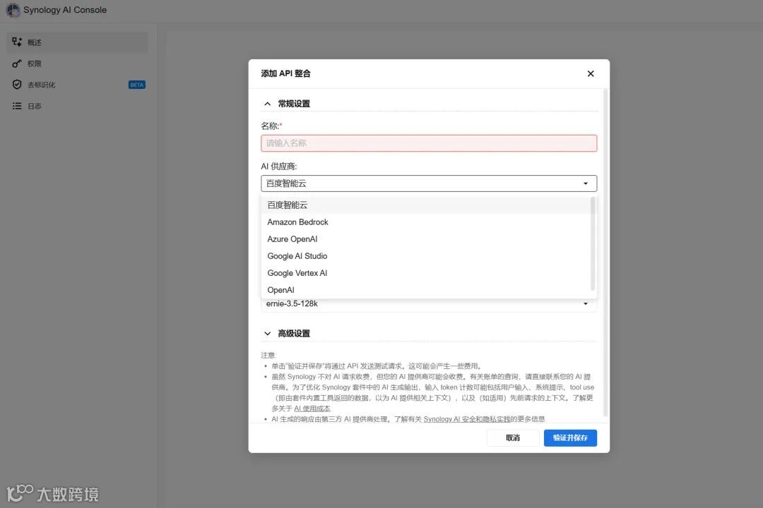 AI是这两年比较火的需求,群晖暂时没有去做更依赖本地算力的本地化部署,而是提供便利且集中式的云服务接口管理,目前OpenAI、Google、微软和百度都可以无缝接入。