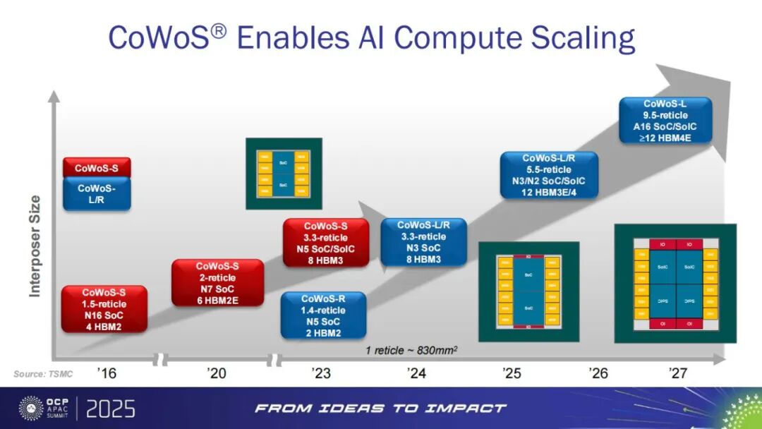 CoWoS® 的核心升级方向是 “中介层尺寸扩展” 与 “先进制程兼容”,以匹配 AI 芯片的算力增长: