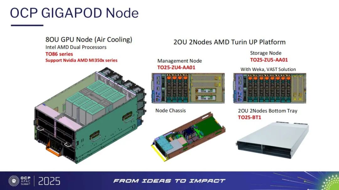 - 技术路线:支持沉浸式液冷与芯片直冷(DLC),适配 OCP 先进冷却标准;推出 OCP GigaPOD 解决方案,单 POD 含 32 个 GPU 节点、2 个管理节点、22 个存储节点,实现计算 - 存储 - 管理的一体化液冷部署。