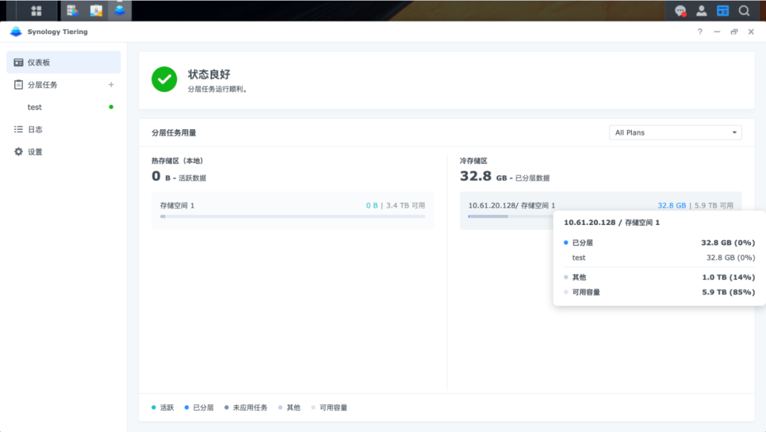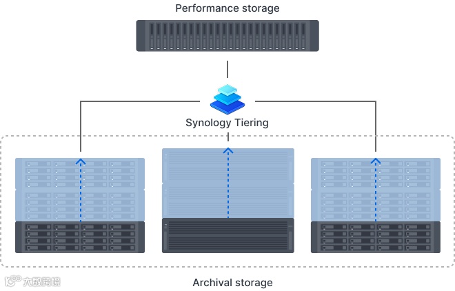 通过 Synology Tiering 统一界面,可一目了然分层任务状态、热/冷区可用容量、健康状态以及详细的系统情况。此外,Synology Tiering 包含 Synology Tiering Vault 套件,允许用户将 Synology NAS 分配为分层计划的冷存储区,这种“同厂端到端”方案减少了跨厂商互通问题,让热/冷之间的数据移动与回迁部署更简便。